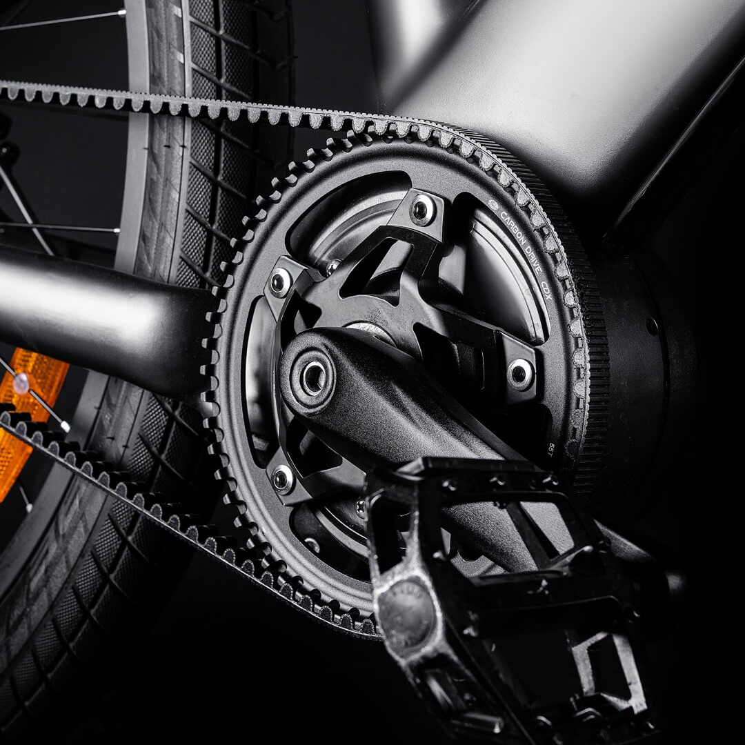 Anstelle eines Kettenantriebs verwendet der Motor einen internen Gates Carbon-Riemenantrieb, der eine Shimano Alfine 8-Gang-Getriebenabe antreibt. Das bedeutet, dass Sie sich nie wieder die Hände (oder Hosen) von Schmieren einer Kette schmutzig machen müssen.